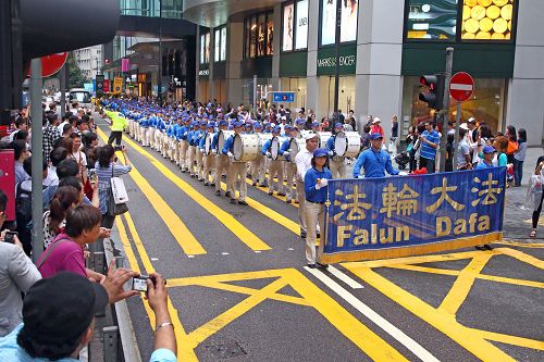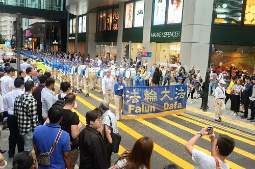 图1-3:天国乐团引领法轮功学员队伍,游行从港岛区英皇道、轩尼诗道,途经闹市铜锣湾、湾仔、中环,最终到西环中联办,历时三个多小时,沿途吸引港民及中西旅客观看。