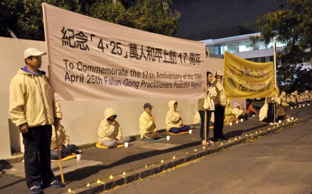 四月二十五日晚,奥克兰法轮功学员在中领馆的路边拉开了百米长的队伍,他们没有任何喧哗与口号,就象当年北京的万人上访,只有舒缓的炼功音乐在空中飘荡。夜晚的秋风略有凉意,更显出法轮功学员的坚毅,队伍中男女老幼静静坐在那里,无声地控诉着中共的罪恶。