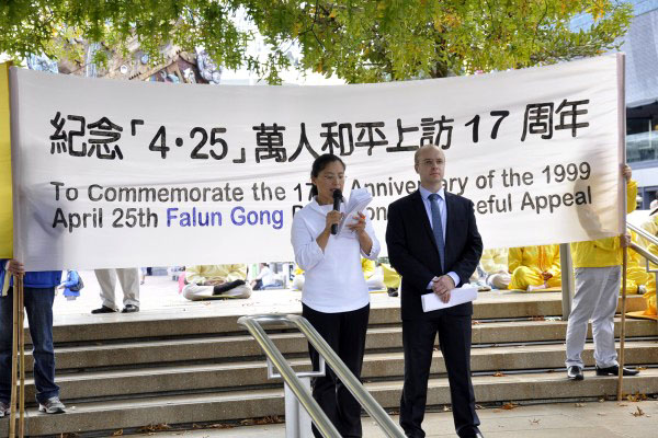 图3:二零一六年四月二十三日中午,新西兰奥克兰法轮功学员在市中心的奥缇亚(Aotea)广场举行了“纪念四二五万人和平上访十七周年”集会。