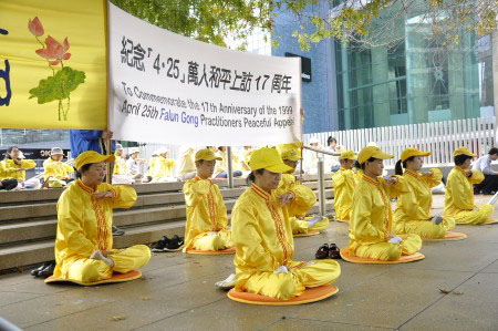 图5:奥克兰法轮功学员在纪念四二五集会上演示功法