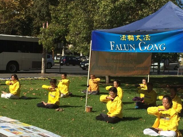 南半球的秋日晴朗气爽,阿德雷德市中心车辆、行人川流不息,身着金黄色服装的法轮功学员平静祥和的炼功场面,吸引着人们的目光。人们专注看展板,主动拿资料,签名共同制止中共的罪恶。