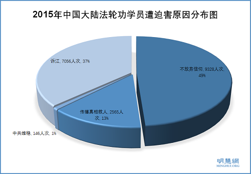 从表2得知,二零一五年因诉江遭迫害的有7056人次,占总迫害人次的37%,不放弃信仰遭迫害的有9328人次,占总人次的49%。遭迫害原因不明的都归入此类,所以在诉江阶段很可能法轮功学员因诉江被抓,7056人次只是最低数。