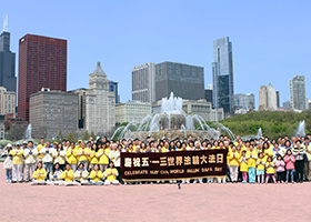 来自大芝加哥地区的法轮功(又称法轮大法)学员聚集在当地著名景点白金汉喷泉,庆祝世界法轮大法日暨法轮大法洪传二十四周年。