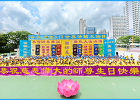 香港法轮功学员在长沙湾游乐场举行集会,向法轮功创始人李洪志先生贺寿,并庆祝世界法轮大法日。