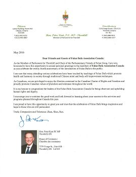 作为康山选区国会议员、加拿大国会法轮大法之友的主席,我很荣幸在庆祝法轮大法传世24周年之际,向加拿大法轮大法学会的成员们送上问候。