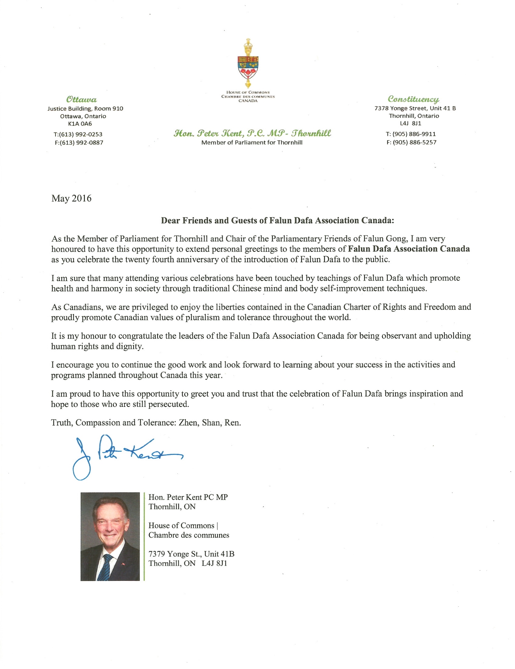 【明慧网二零一六年五月十日】第十七届“世界法轮大法日”即将来临,为庆祝这个美好的节日和法轮大法传世二十四周年,加拿大各级政要纷纷发出贺信和褒奖。他们颂扬法轮大法“真、善、忍”的修炼原则,并感谢法轮功学员多年来对社区所做出的卓越贡献。