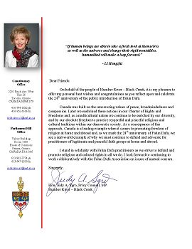 代表 Humber River – Black Creek选区的居民,在你们回顾和庆祝法轮大法传世24周年之际,我荣幸地呈上我个人最良好的祝愿与祝贺。