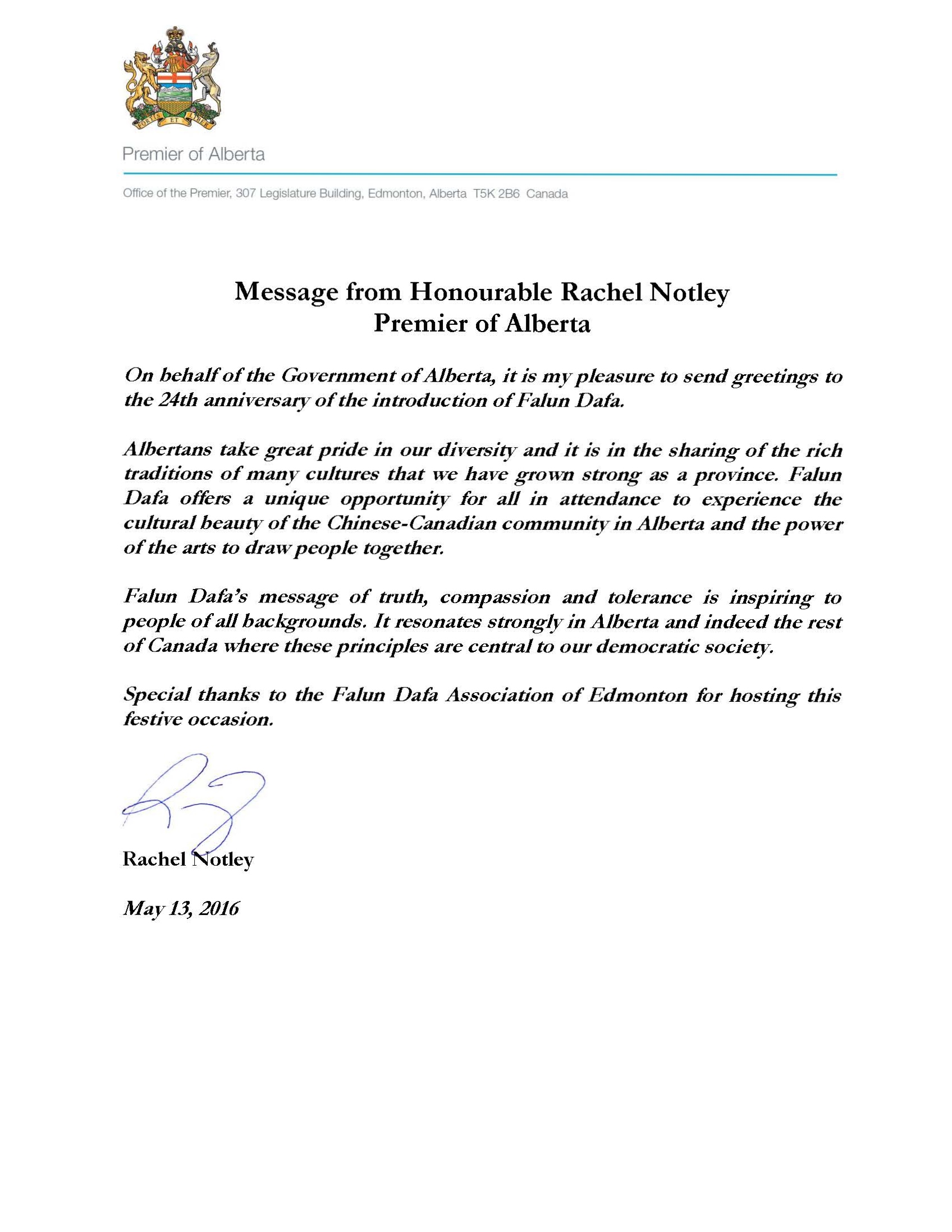 代表亚伯塔省政府,我荣幸地向法轮大法传世24周年呈上祝贺。