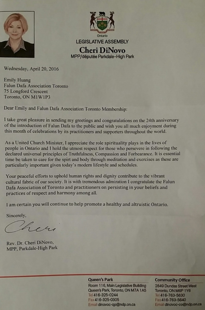 安省Parkdale-High Park选区省议员迪努沃(Cheri DiNovo)的贺信: