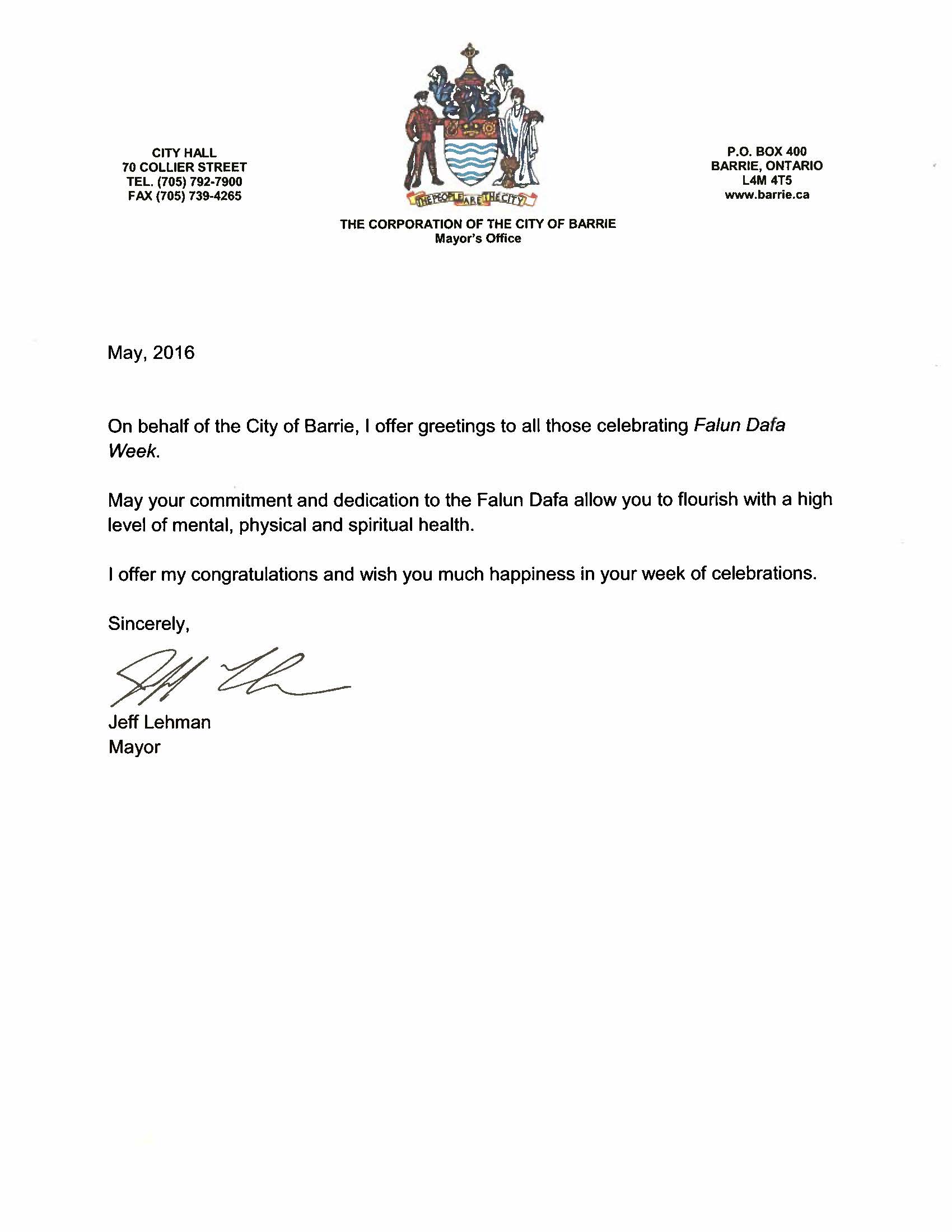 巴里市长雷曼(Jeff Lehman)的贺信: