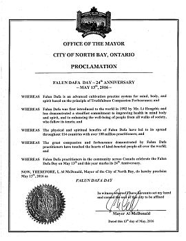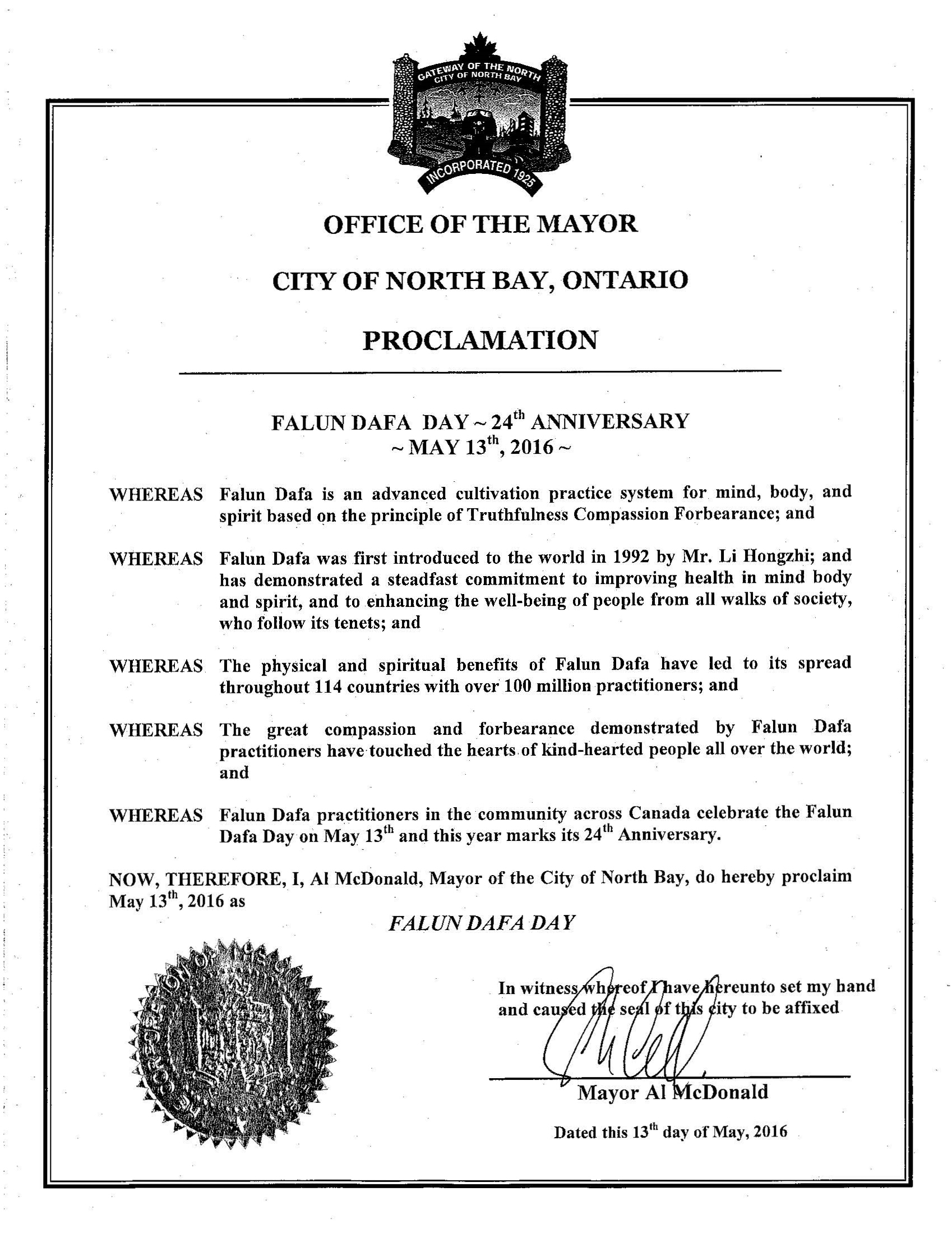 我,Al McDonal,北湾(North Bay)市长,特此宣布2016年5月13日为法轮大法日。