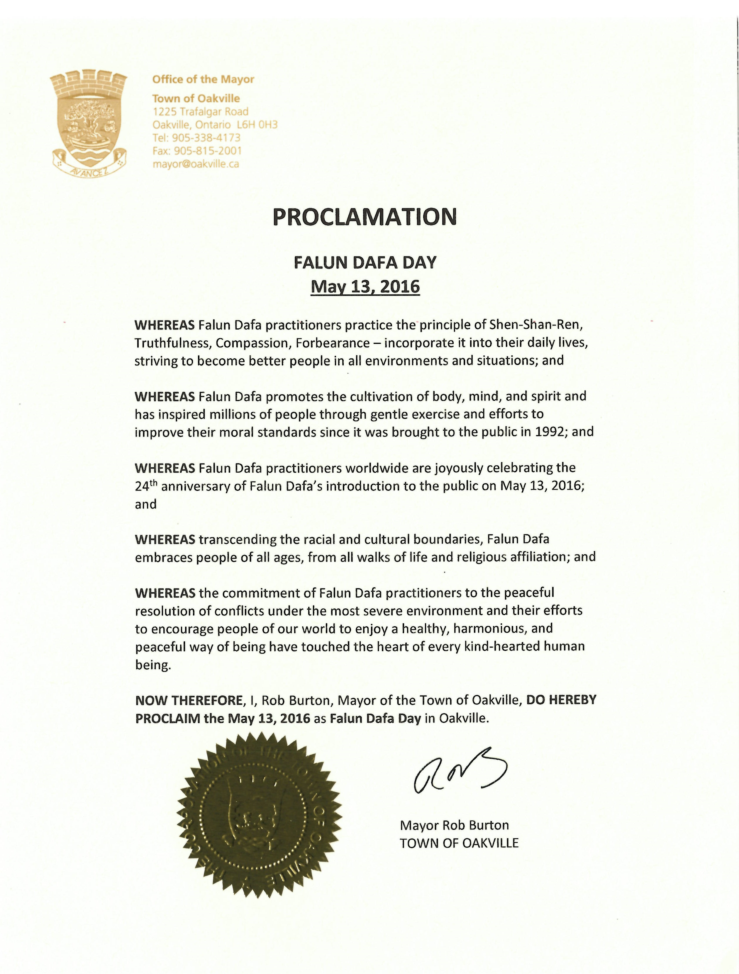 我,伯顿(Rob Burton),奥克维尔市长,特此宣布2016年5月13日为奥克维尔法轮大法日。