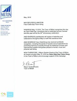 鉴此,我,米尔顿市长克兰茨,特此宣布2016年5月13日为米尔顿法轮大法日(法轮功日)。