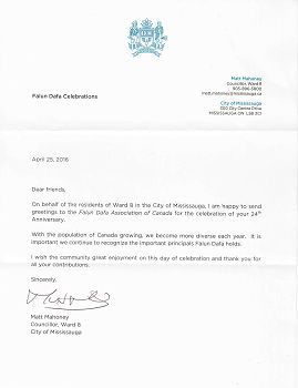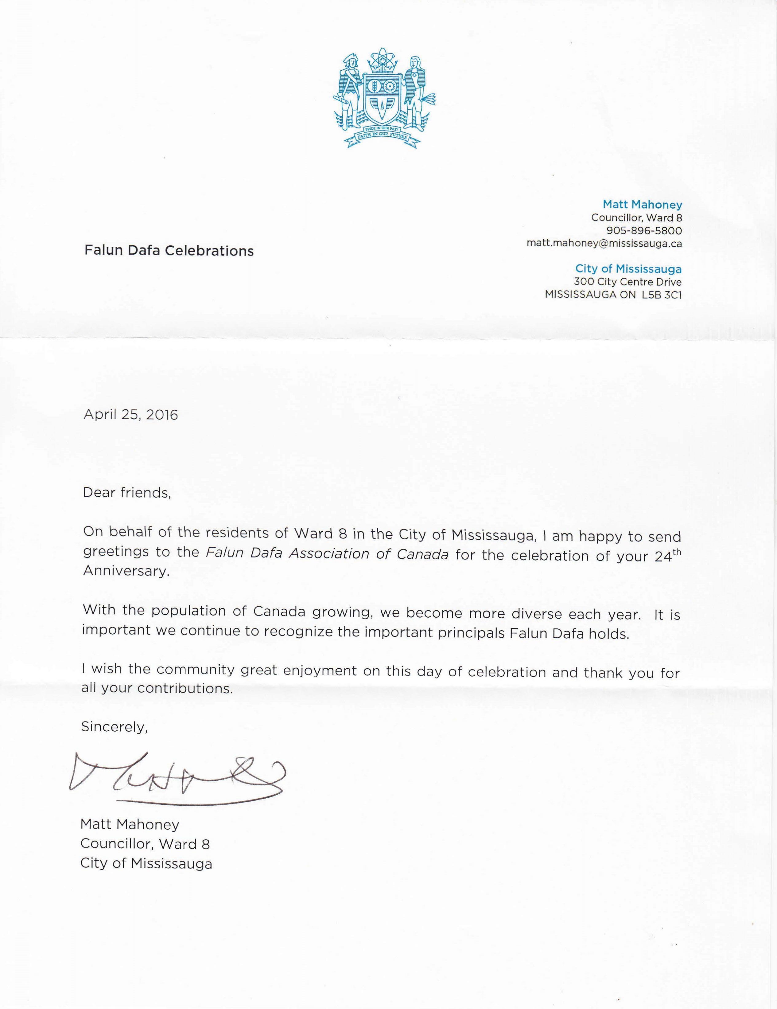 密西沙加市第八选区市议员马奥尼(Matt Mahoney)的贺信: