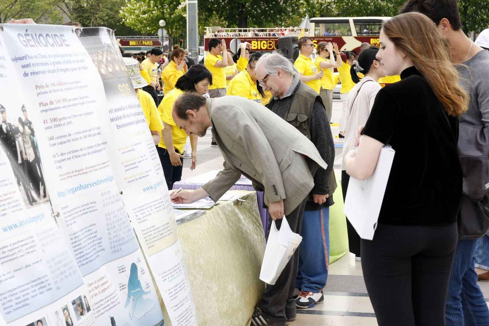当天下午,艾菲尔铁塔下的人权广场上人流如潮。法轮功学员表演了传统乐器演奏,优美的民间舞蹈,安静、祥和的炼功、打坐,吸引了游人的注意力,他们围观、拍摄,鼓掌、喝彩。另一边,同时摆放了真相展板,人们了解真相后都在征签表上签字,支持法轮功反迫害。