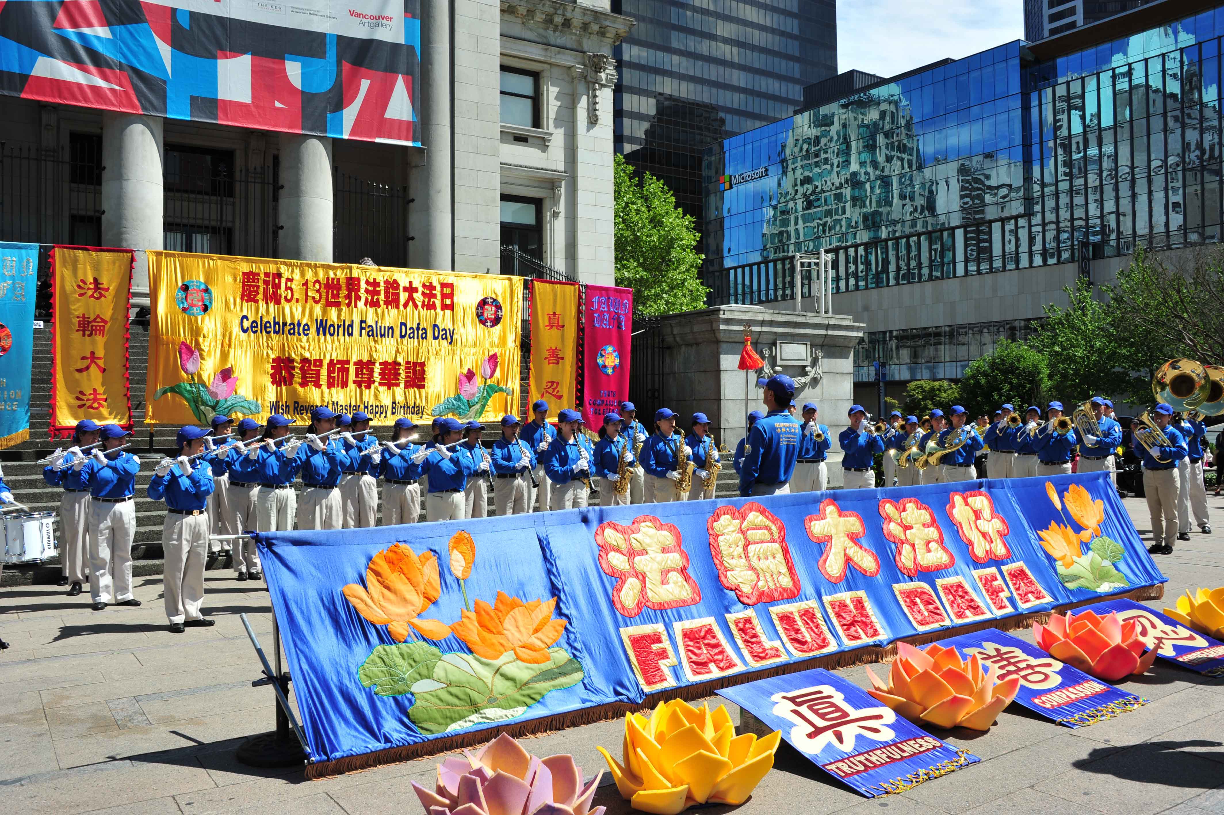 图1:温哥华法轮功学员在市中心艺术馆前举行活动,庆祝法轮功创始人李洪志先生六十五华诞。