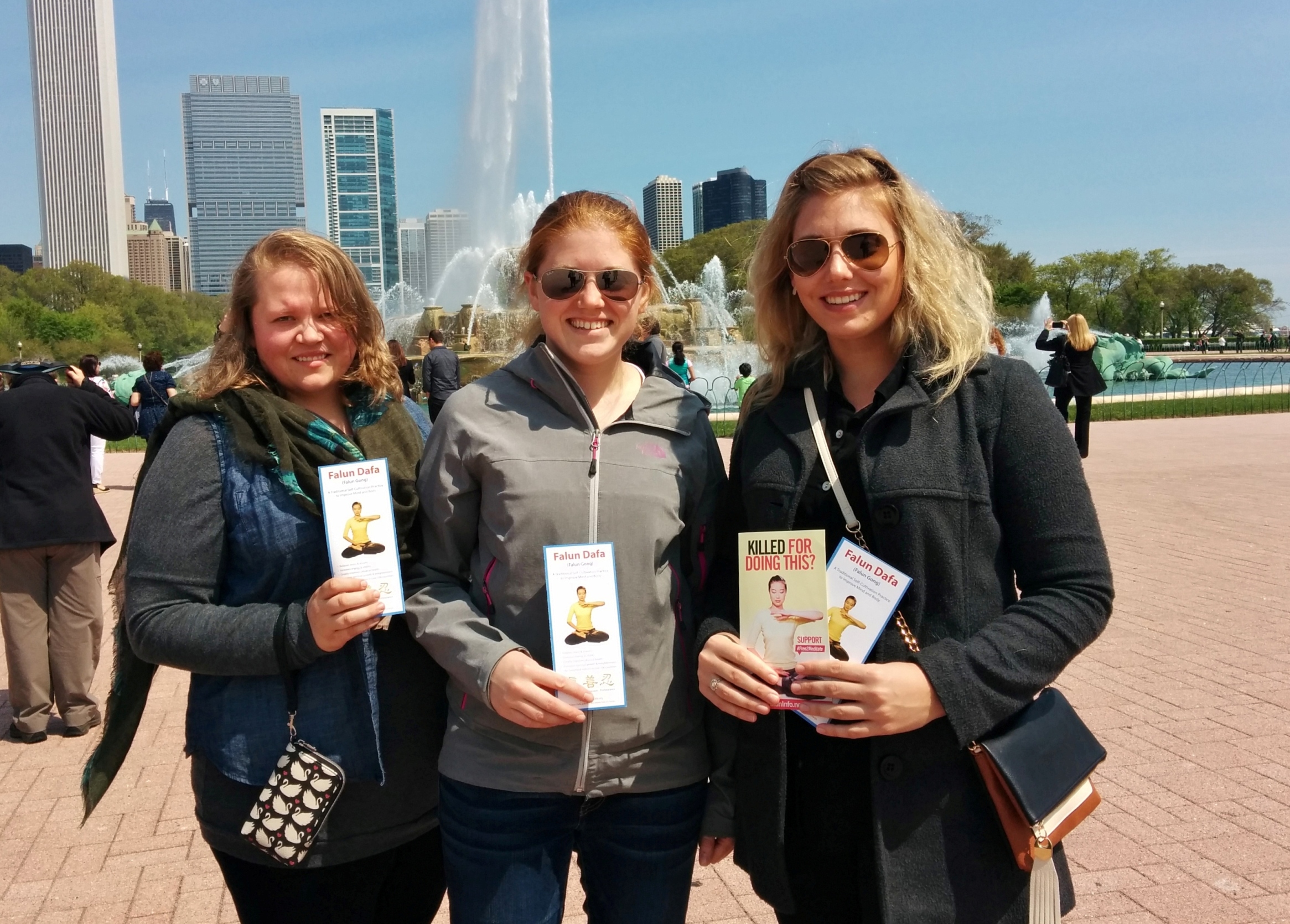 【明慧网二零一六年五月十日】每年的五月十三日是“世界法轮大法日”,全球各地的法轮功学员都会在这前后举行庆祝活动,美国芝加哥的学员也不例外。二零一六年五月八日, 来自大芝加哥地区的法轮功(又称法轮大法)学员聚集在当地著名景点白金汉喷泉(Buckingham Fountain),庆祝世界法轮大法日暨法轮大法洪传二十四周年。