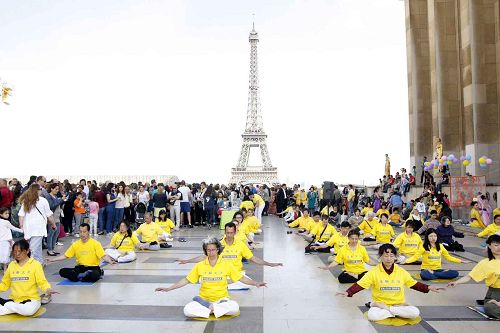 当天下午,艾菲尔铁塔下的人权广场上人流如潮。法轮功学员表演了传统乐器演奏,优美的民间舞蹈,安静、祥和的炼功、打坐,吸引了游人的注意力,他们围观、拍摄,鼓掌、喝彩。另一边,同时摆放了真相展板,人们了解真相后都在征签表上签字,支持法轮功反迫害。