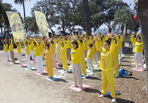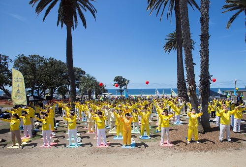 图5:五月八日,洛杉矶学员在圣莫妮卡码头公园欢庆世界法轮大法日,祝师父节日快乐。