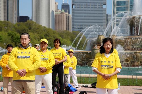 ![]() 图2-4:大芝加哥地区法轮功学员在白金汉喷泉广场集体炼功 |