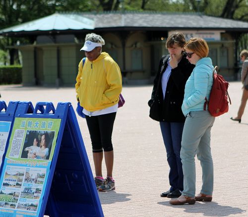 八日天气晴朗,气温宜人,大喷泉旁边来来回回有不少行人和游客。祥和的炼功音乐在喷泉广场上响起,法轮功学员打起“庆祝五一三世界法轮大法日”的横幅,静静炼功,向世人展示大法的美好。旁边的展板吸引了不少行人驻足观看,仔细阅读有关大法洪传和法轮功在中国遭受迫害的真相。