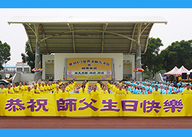 台湾苗栗法轮功学员,齐聚竹南运动公园展开一系列活动,庆祝五月十三日法轮大法弘传世界二十四周年暨法轮功创始人李洪志大师六十五华诞。