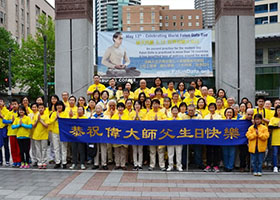 五月八日,美国西雅图法轮功学员在西雅图市中心的西湖公园(Westlake Park)庆祝“五一三”世界法轮大法日和恭贺李洪志大师华诞。