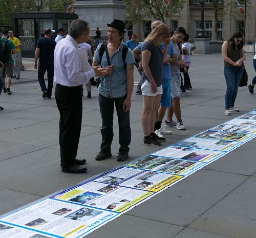 ![]() 图13:经营摄影室的伦敦人保罗了解法轮功真相,五月八日,在鸽子广场再次被法轮功学员集体炼功讲真相的场面所吸引。 |