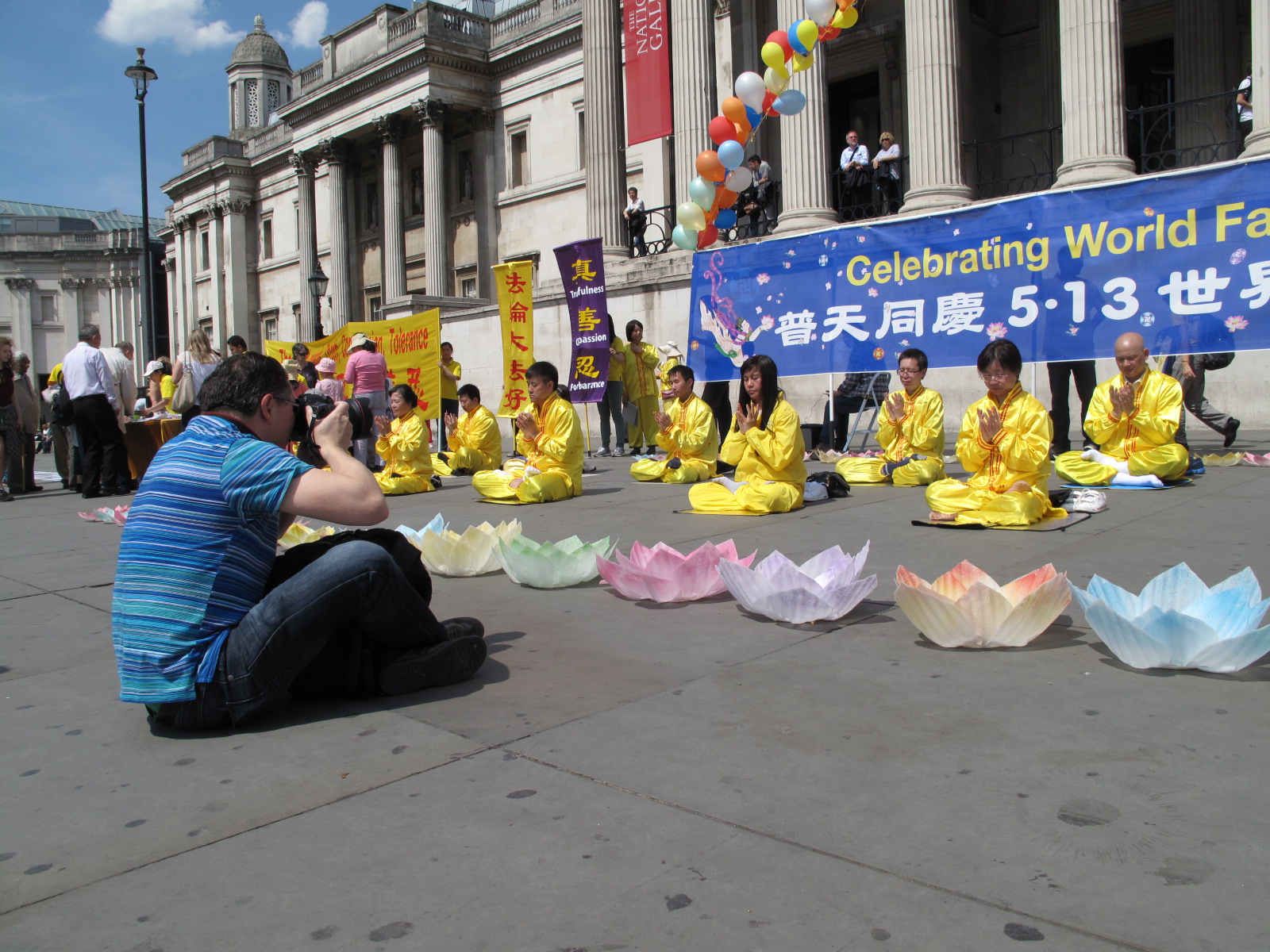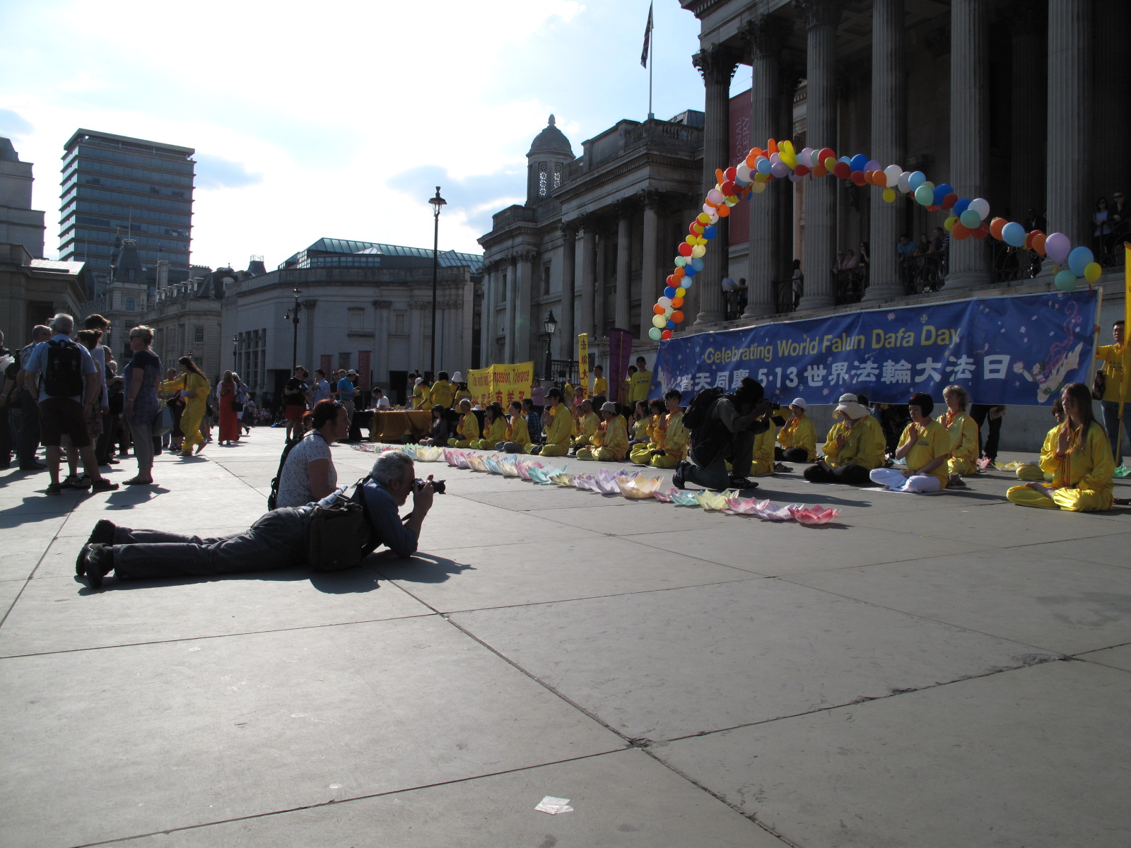![]() 图14:五月八日,瓦特福德(Watford)摄影俱乐部的约翰(趴在地上摄影者)在鸽子广场看到英国法轮功学员庆祝法轮大法日活动,被法轮大法的美好所吸引,把焦点对准正在展示法轮功功法的法轮功学员 |