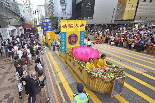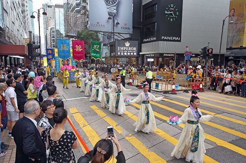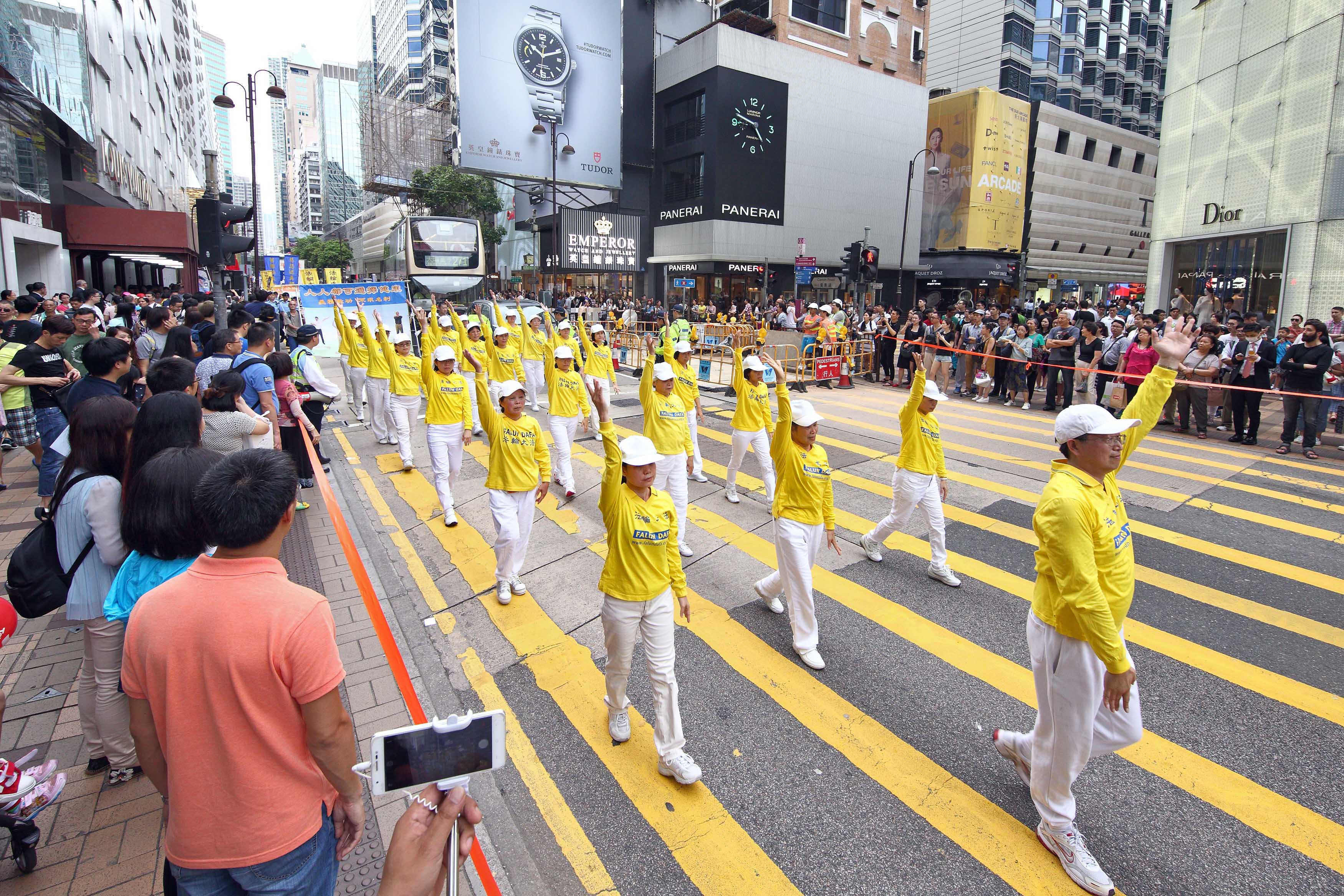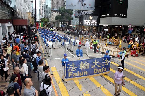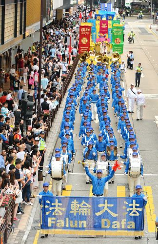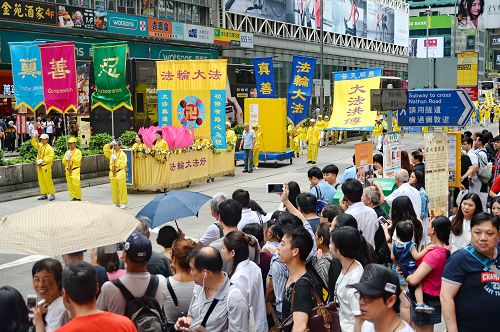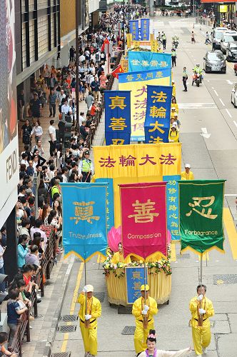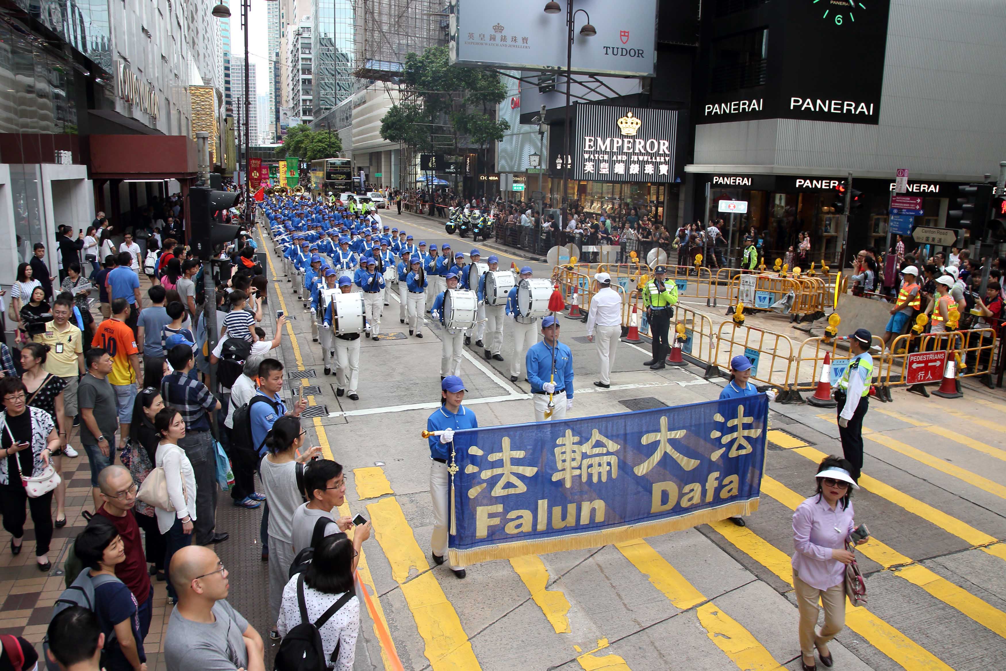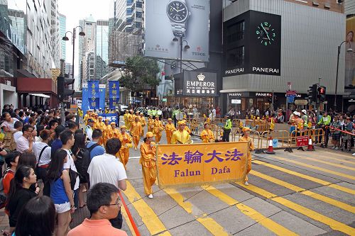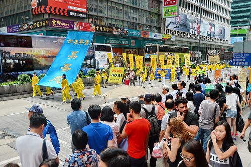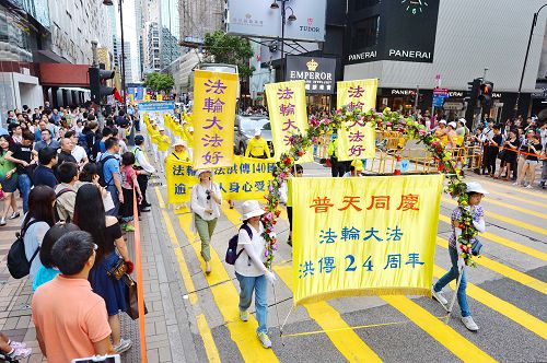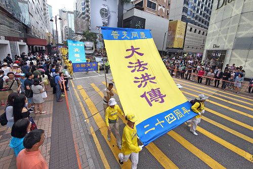 图1-5:法轮功学员游行庆祝“世界法轮大法日”,及“法轮大法弘传世界二十四周年”纪念,吸引香港市民及中西游客驻足关注及拍照。