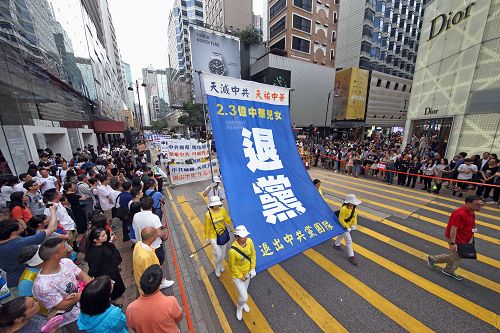 三位二十岁出头的年轻女孩结伴来港自由行,从法轮功学员小红手上接过真相资料,驻足聆听、明白真相之后,都请小红帮忙各取化名退团、退队,她们高兴的向小红道谢,才快步追向法轮功游行队伍方向而去。