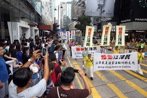 图15-20:法轮功学员希望民众了解真相,在游行队伍中打出了揭迫害、唤良知、启善念、劝三退,及全球控告迫害元凶江泽民等横幅。