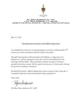 庆祝法轮大法洪传二十四周年,加拿大各级政要和领袖人物纷纷发出贺信和褒奖