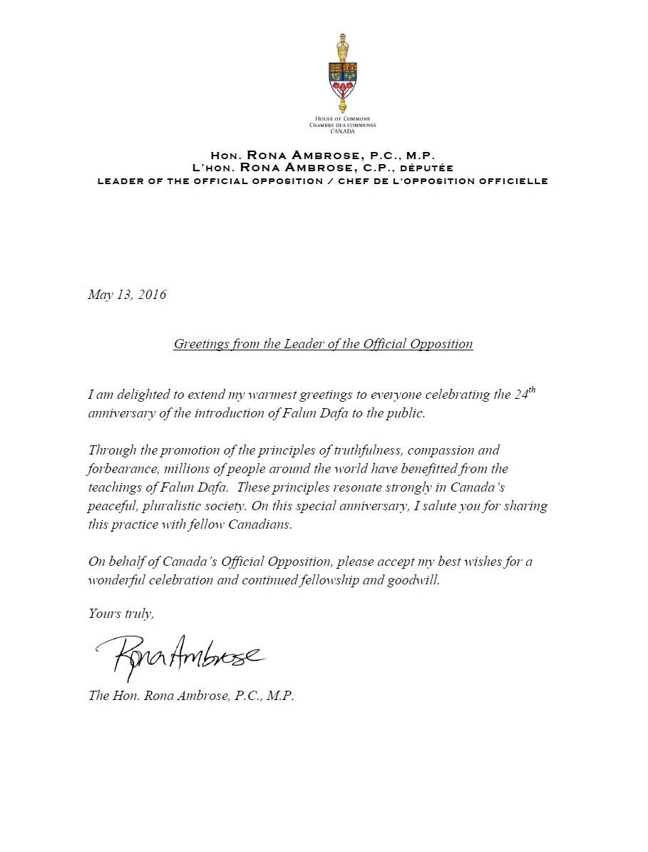 加拿大官方反对党领袖安布罗斯(Rona Ambrose)的贺信