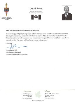 我很高兴地向在多伦多、加拿大其它城市及世界其它国家庆祝法轮大法传世24周年的人们,呈上我衷心的祝贺。让我们利用这一天来庆祝法轮功学员24年来不懈的努力,他们通过“真、善、忍”的指导原则,使我们的社会更和平与协和。