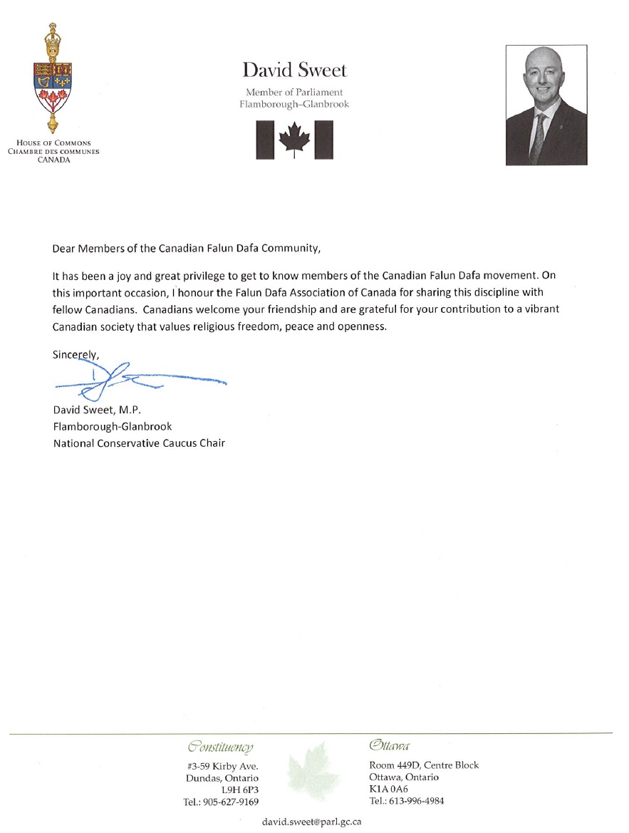 通过提倡“真、善、忍”的原则,世界各地的千百万人已经从法轮大法的教诲中获益。这些原则在加拿大和平与多元的社会产生了强烈的共鸣。在这个特殊的纪念日子,我向你们致敬,因为你们与加拿大人分享这一功法。