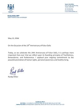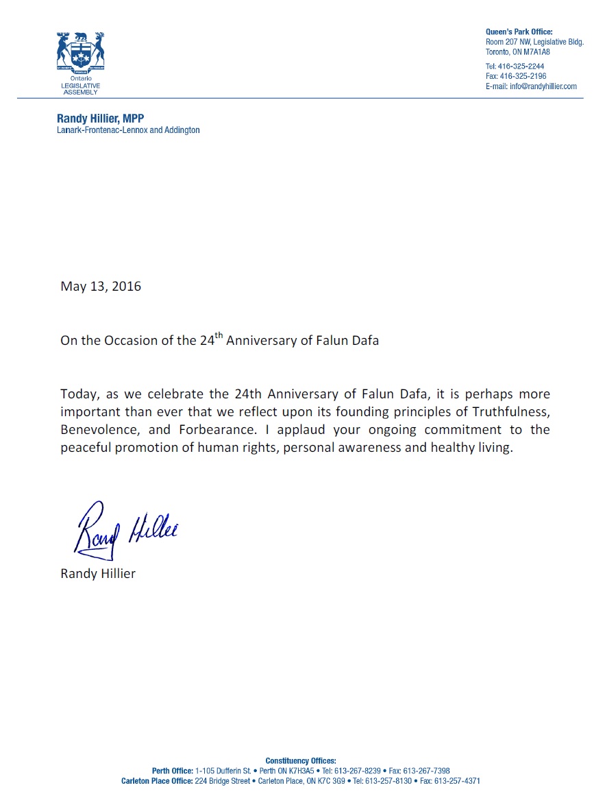 加拿大安省议员希利尔(Randy Hillier)的贺信
