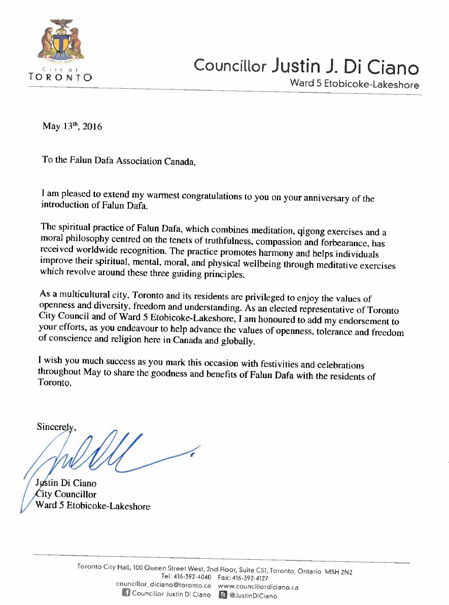 加拿大多伦多市议员迪齐亚诺(Justin J. Di Ciano)的贺信译文: