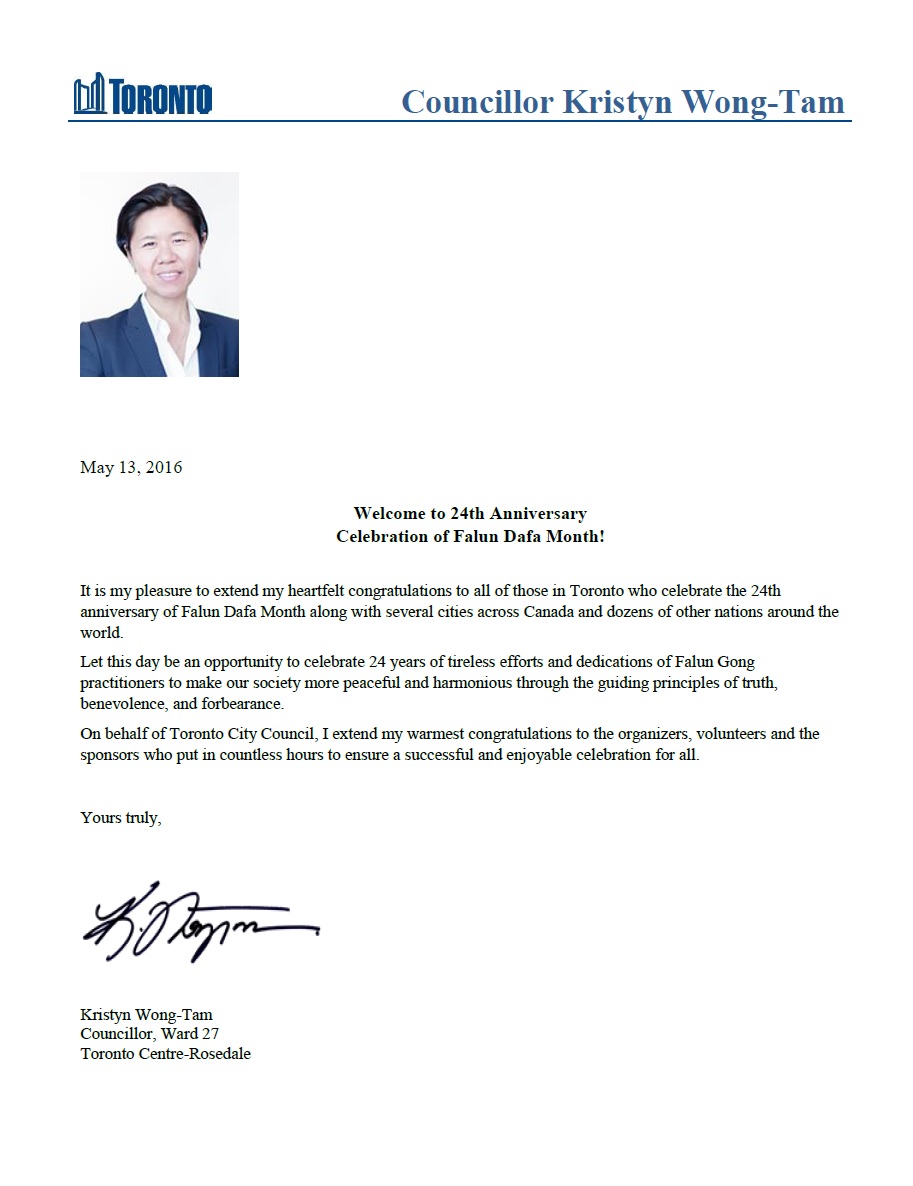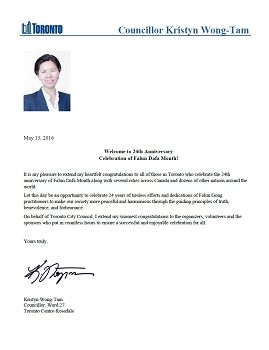加拿大多伦多市议员黄慧文(Kristyn Wong-Tam )的贺信