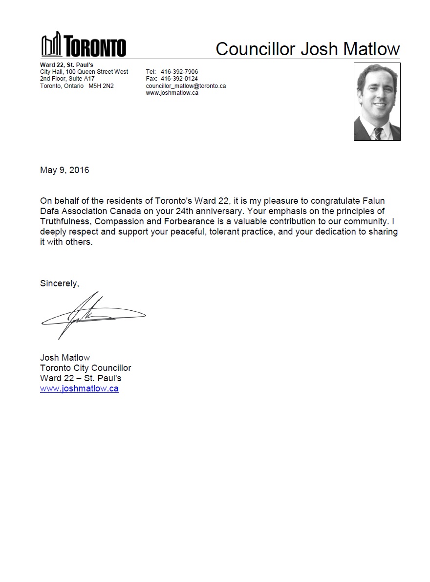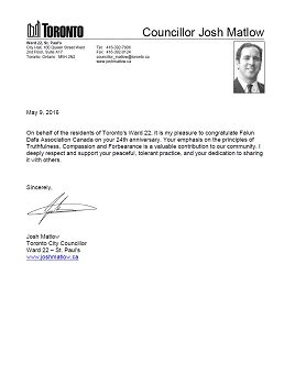 加拿大多伦多市议员马特楼(Josh Matlow)的贺信译文: