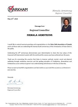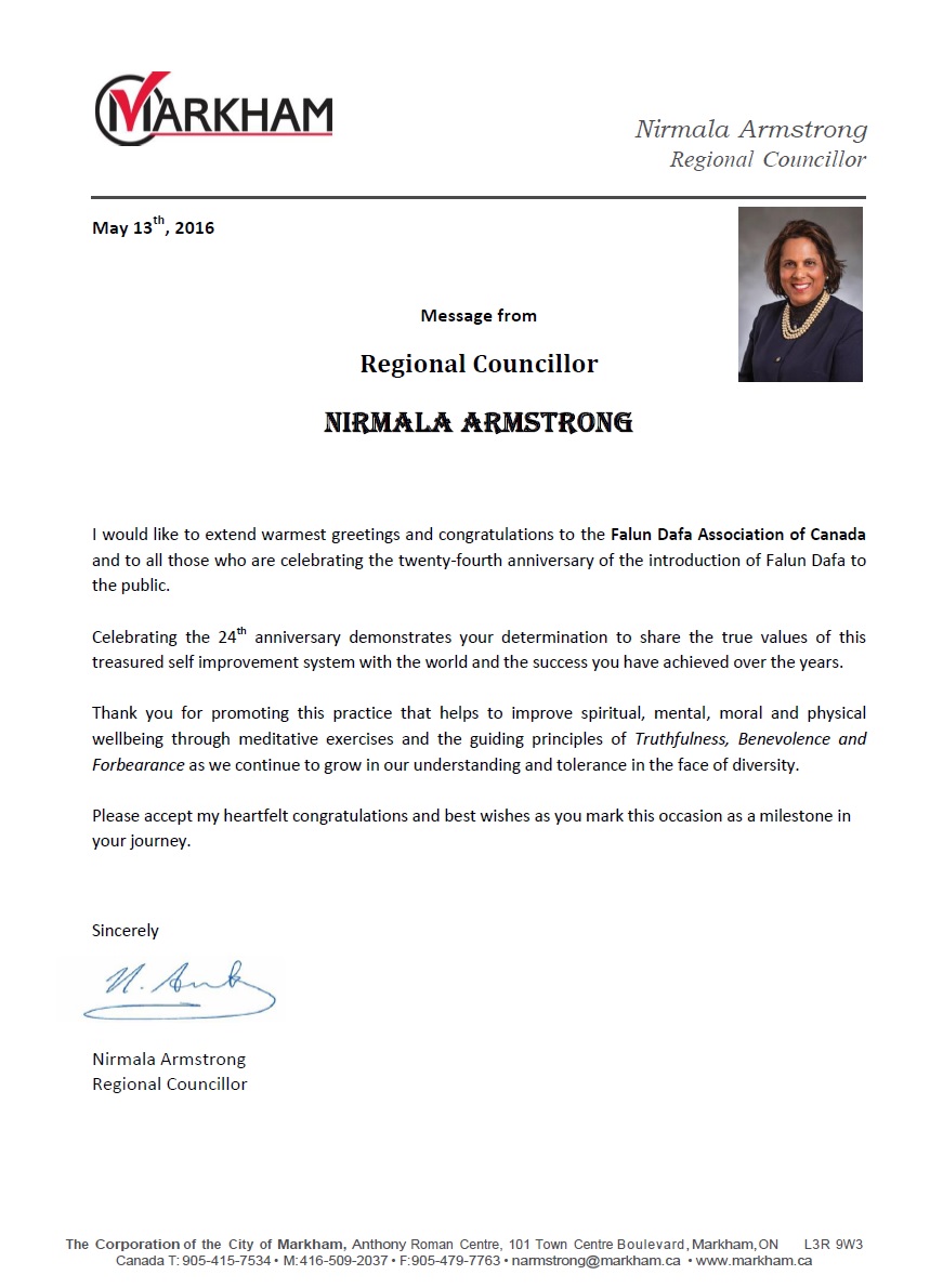 加拿大约克区区域议员(Nirmala Armstrong)的贺信