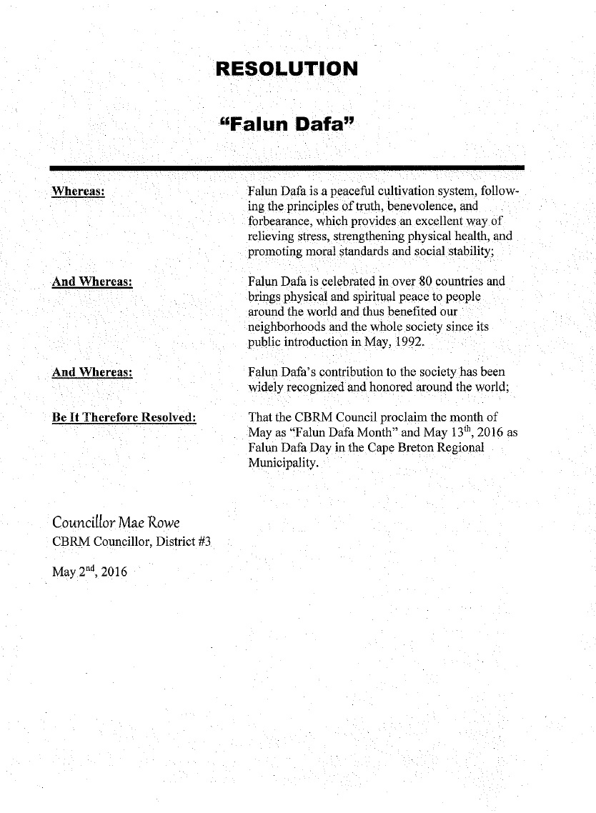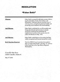 特此,布雷顿角(Cape Breton)议会宣布5月为“法轮大法月”,5月13日为“法轮大法日”。