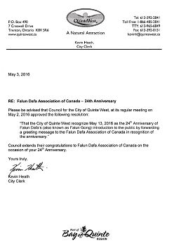 在加拿大法轮大法学会庆祝法轮大法洪传24周年之时,昆特西市议会向佛学会致以祝贺。