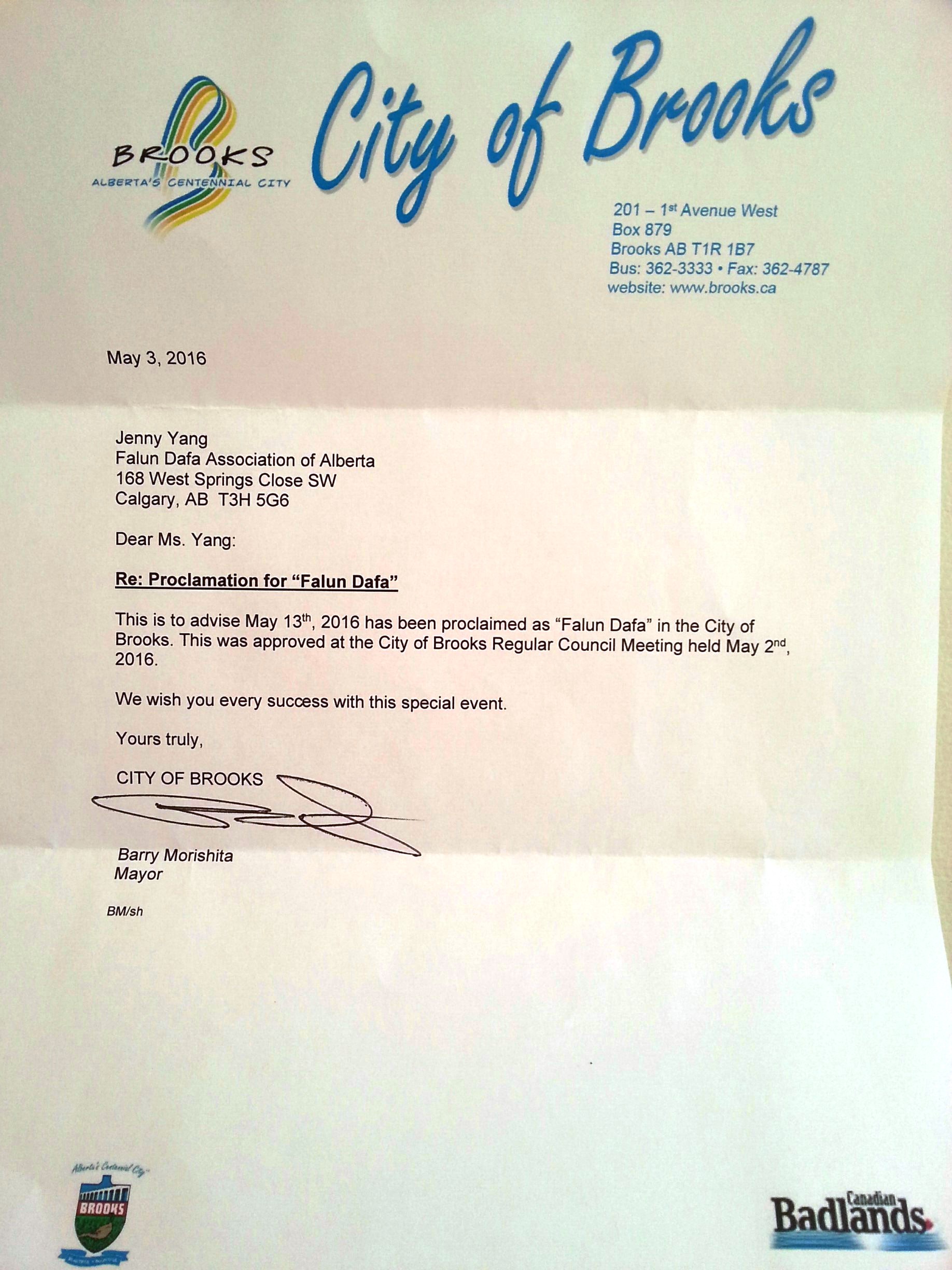 布鲁克斯(Brooks)市长巴里·森下(Barry Morishita)宣布“法轮大法日”的贺信译文: