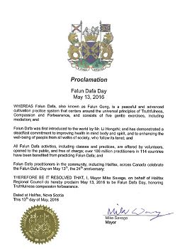 鉴于此,我,市长迈克·萨维奇,代表哈利法克斯市政局特此宣布,二零一六年五月十三日为法轮大法日,以表彰真善忍。