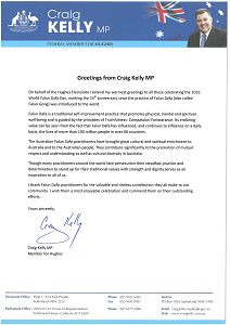 凯利议员赞扬澳洲的法轮功学员为促进相互尊重和理解,以及对澳洲的多元文化做出了显著的贡献。他表示:“作为一名联邦议员,我的责任是要站出来说,法轮大法是好的。真善忍应该在全世界受到尊重。”
