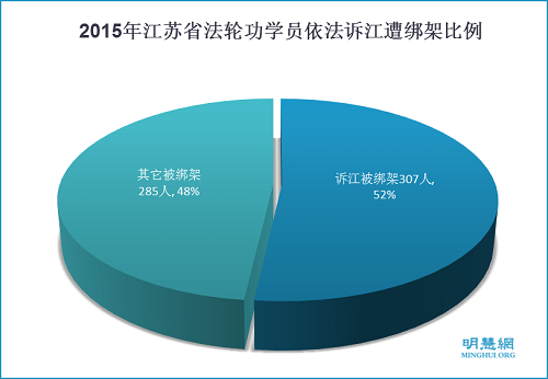 【明慧网二零一六年五月十二日】(明慧网通讯员江苏综合报道)截至二零一六年四月,据明慧网报道所做的不完全统计,二零一五年,江苏省法轮功学员被绑架五百九十二人次,其中,三百零七人次因依法控告迫害元凶江泽民被绑架,占总被绑架人数的一半以上(百分之五十二)。