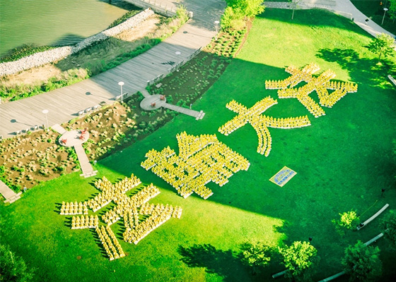 五月十二日,来自世界各地一千一百名法轮功学员身着金黄色服装,在纽约甘纯公园排出“法轮大法”四个金光闪闪的大字。