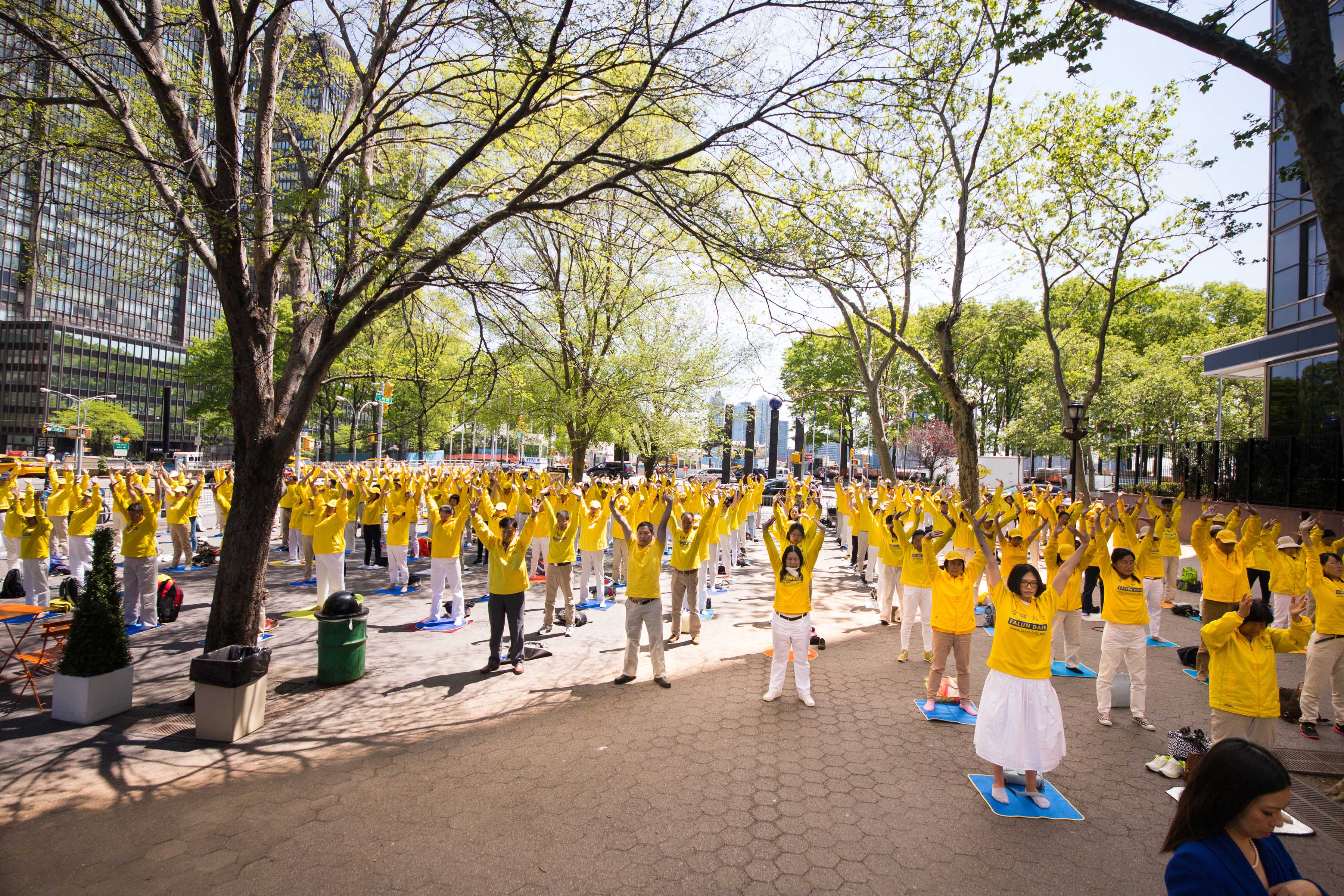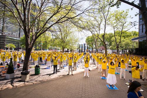 ![]() 图1-4:庆祝“五一三”世界法轮大法日,二零一六年五月十二日,部分来自世界各地的法轮功学员来到位于在曼哈顿二大道旁的联合国达格•哈玛绍广场公园(UN Dag Hammarskjold Plaza Park)集体炼功,展示大法的美好,传播大法的真相。 |