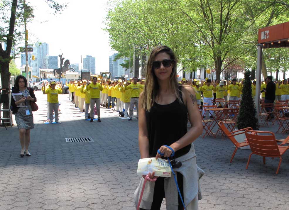 已在纽约生活十几年的安东尼娅是位厨师,母亲是西班牙人、父亲是德国人,家族中有犹太血统,而她自己对东方文化有特殊的兴趣,也曾练过太极、喜爱打坐,相信善恶有报,当天因为偶然的原因路过联合国前法轮功的集体炼功,深受感动。她表示说她相信发生的一切都是有安排的,她为自己能够遇到法轮大法的炼功场面感到幸运,她说自己以前听说过法轮功,但集体炼功场面带给她的冲击很大,另外,与法轮功学员的交谈让她对中国的真相更清楚了。